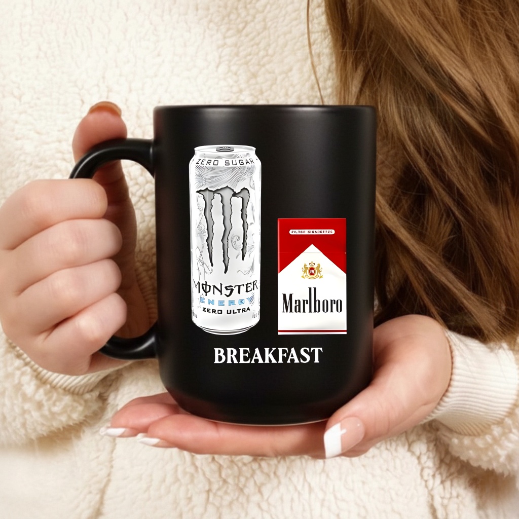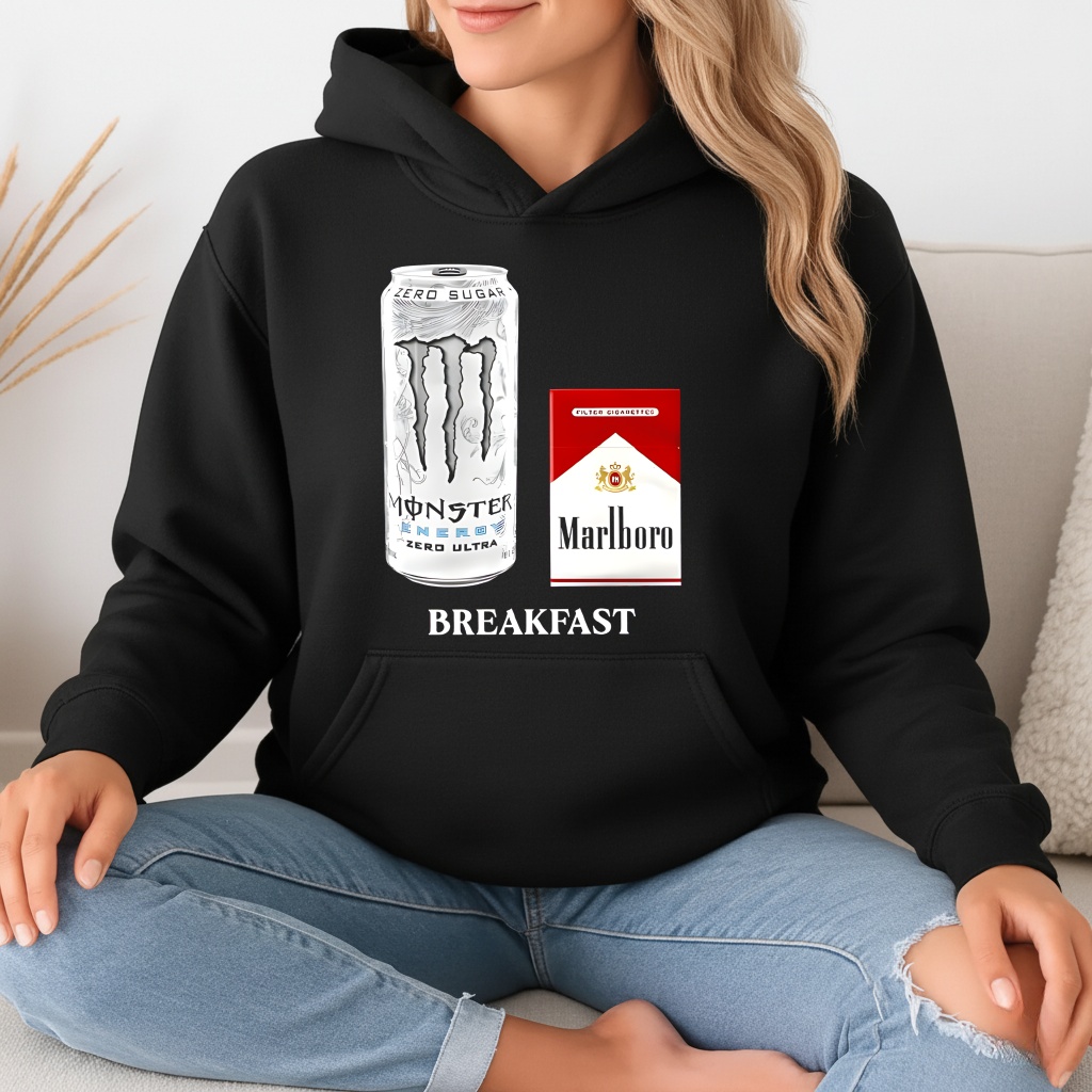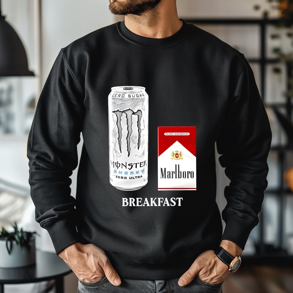 Is the “White Monster” design recognizable? Yes, the graphic on the Monster Marlboro breakfast shirt clearly depicts the iconic textured white can (Zero Ultra) alongside the red pack, making the meme instantly recognizable to those in the know.