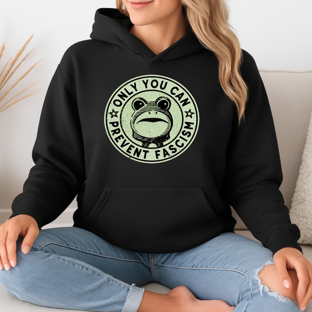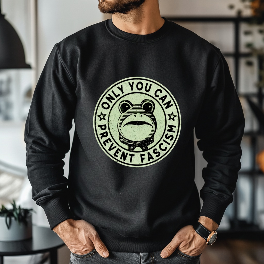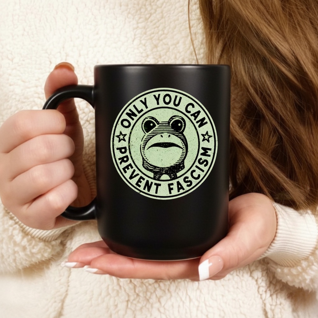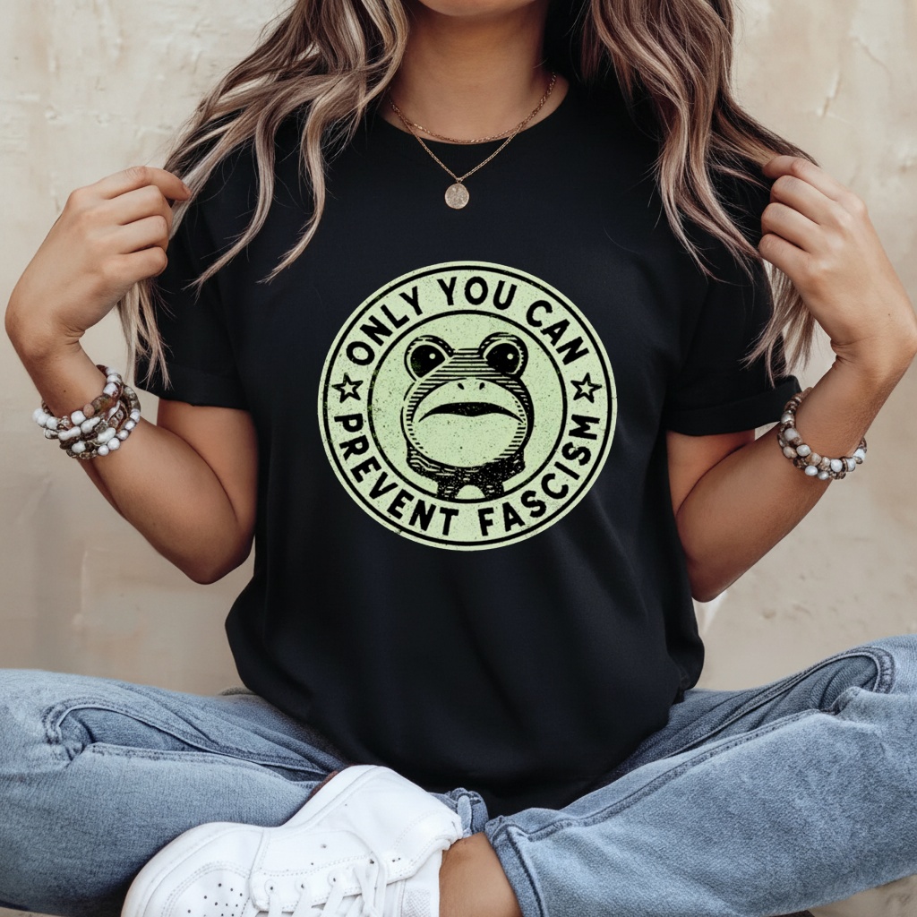 He is small, he is green, and he demands accountability. This satirical design puts a charming twist on a classic forest safety slogan, featuring a determined frog reminding you that preventing authoritarianism is everyone’s job.