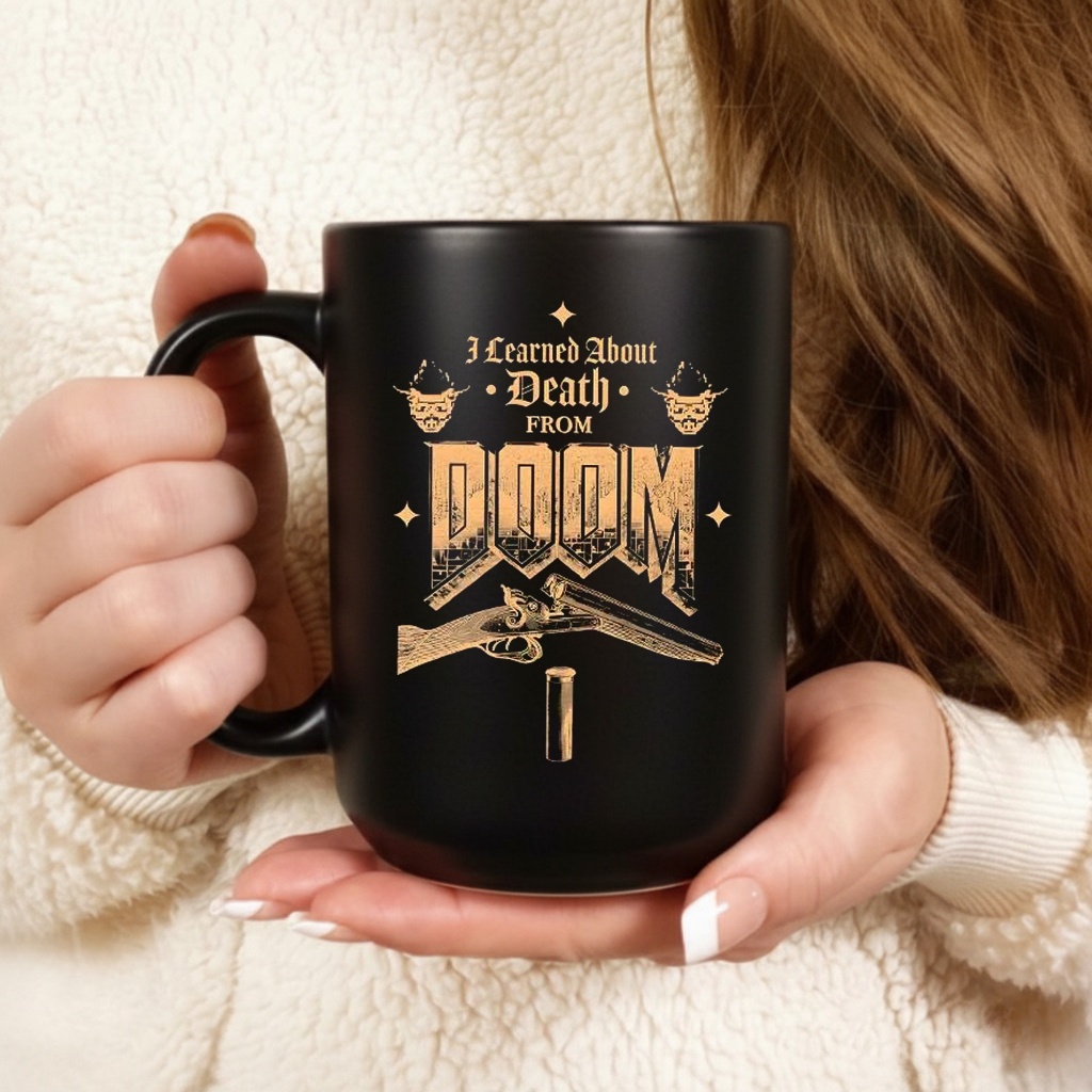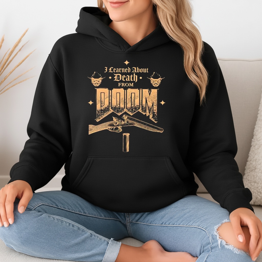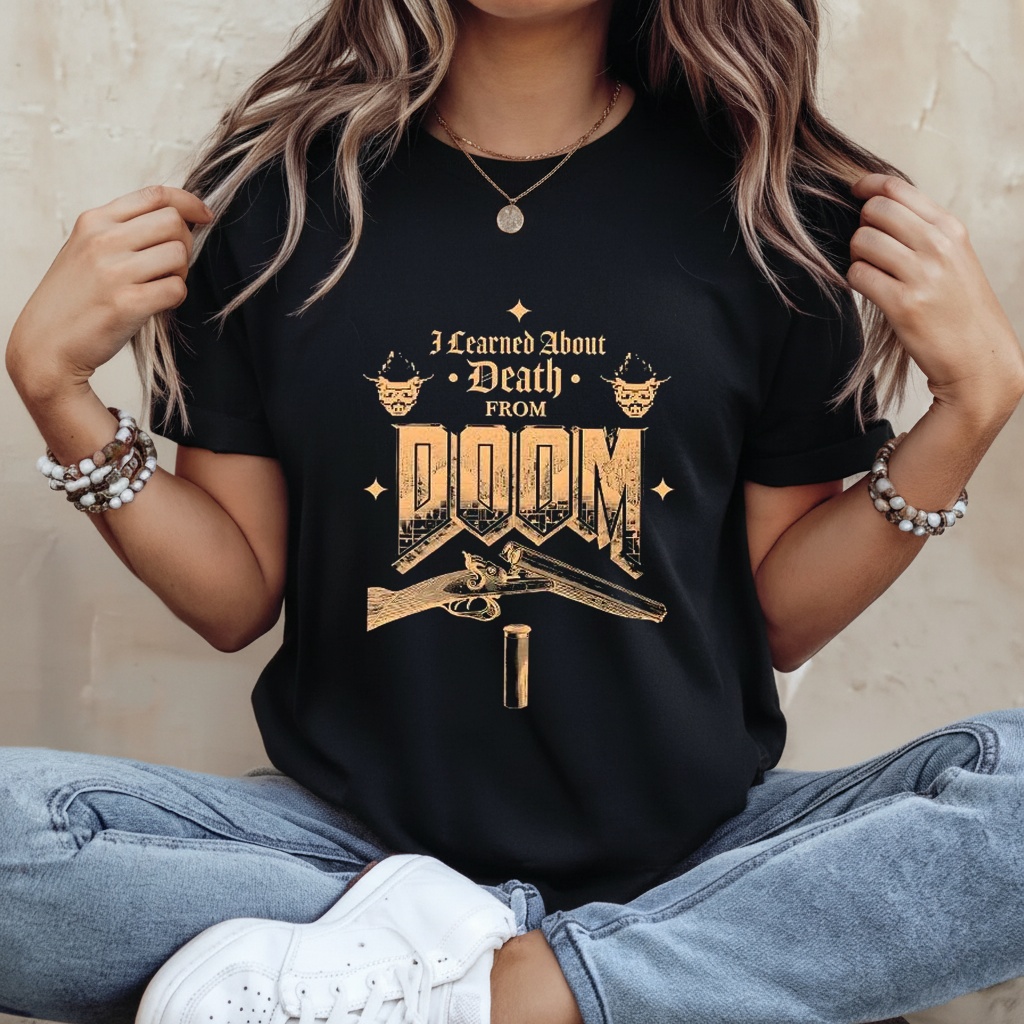 Before there were tutorials, there was just the “Game Over” screen. This retro gaming tee features the slogan “I Learned About Death From Doom,” a dark humor tribute to the brutal difficulty and visceral impact of the grandfather of all FPS games.
