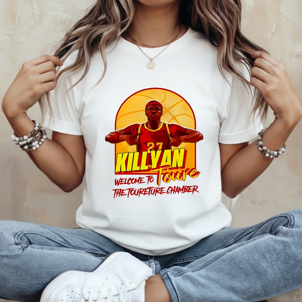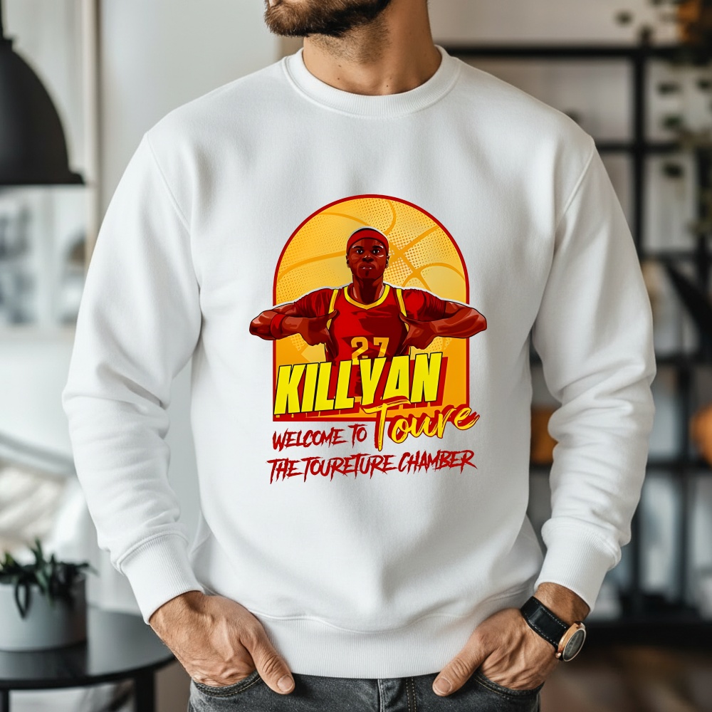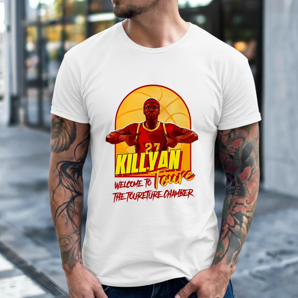 The Killyan Toure Welcome to the Toureture Chamber Shirt is all about attitude. Built around bold wordplay, the design transforms a player welcome into a statement of dominance, intensity, and competitive fire. It’s the kind of slogan that sounds like it belongs in a packed arena—loud, unapologetic, and meant to intimidate opponents before the game even starts.