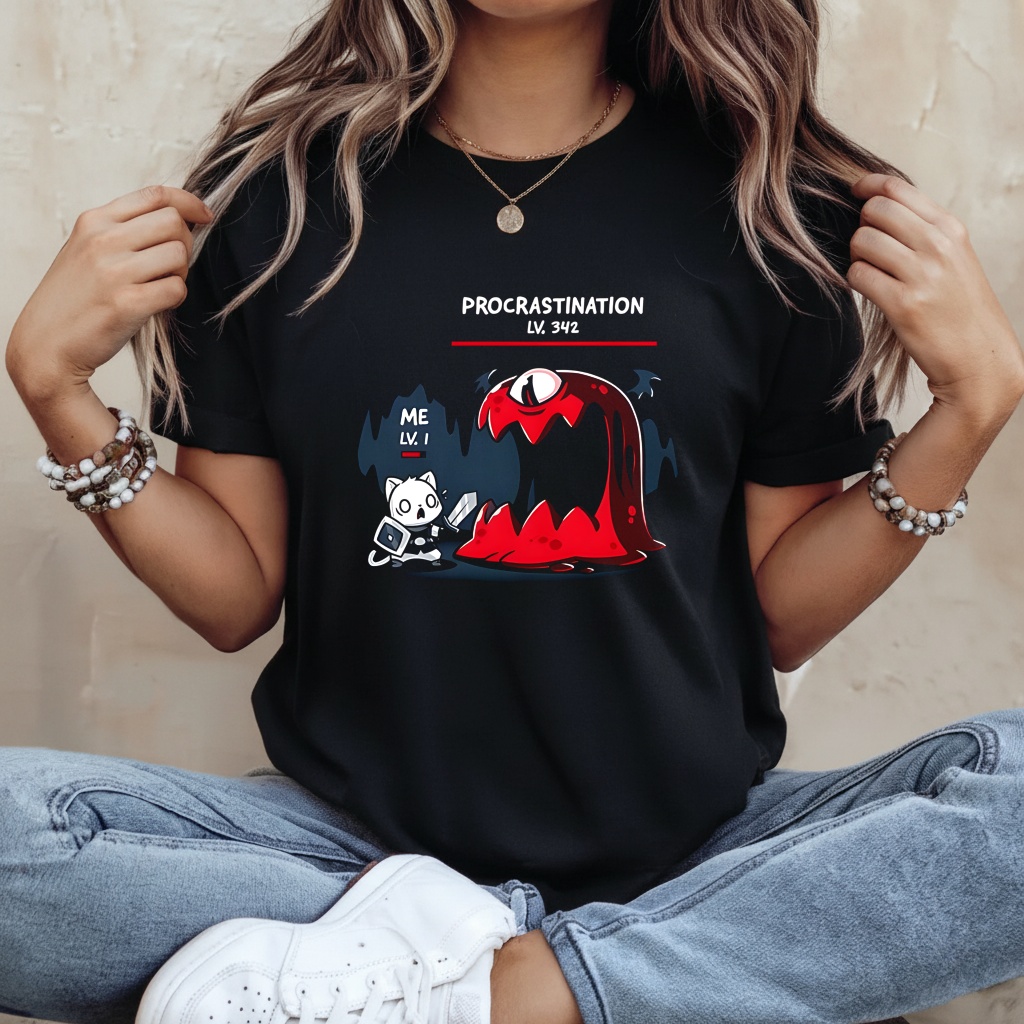 We have all been there: You walk into the boss room, your armor is broken, you have no potions, and the enemy is 300 levels above you. The Me Lv1 vs Procrastination Lv342 Gamer Meme shirt visualizes the most relatable battle in human history through the lens of a classic RPG interface. On one side, there is you—a humble Level 1 character just trying to survive the day. On the other side is Procrastination—a Level 342 titan with a massive health bar that never seems to go down.
