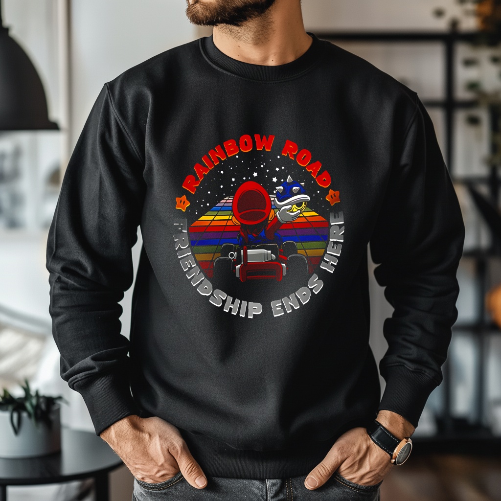 The design plays on the universal chaos of Rainbow Road—tight turns, sudden falls, and perfectly timed betrayals that can flip a race in seconds. It’s funny because it’s true, and that honesty is what makes the message land. Whether you’ve been knocked off the track at the last second or delivered the decisive move yourself, the shirt reflects the playful intensity that defines classic multiplayer gaming.